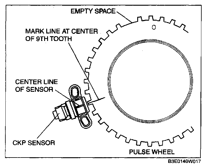 3. Install the CKP sensor where the center line marked in Step 2 and the CKP sensor center line are aligned.