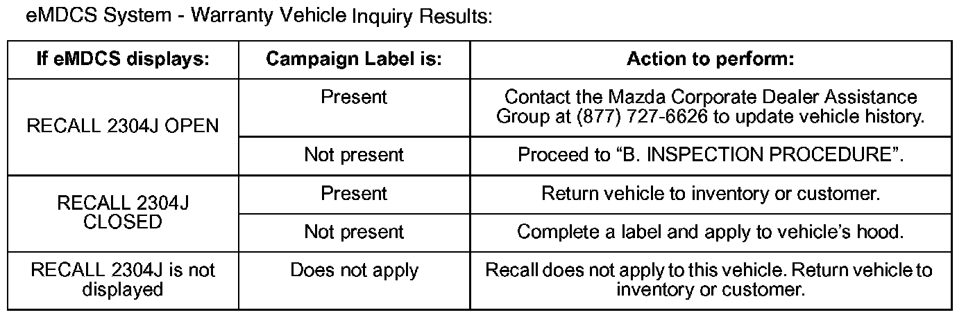 2. Perform a Warranty Vehicle Inquiry using your eMDCS System and inspect vehicle for an Authorized Modification Label Recall 2304J attached to the vehicle's hood. Refer to eMDCS System - Warranty Vehicle Inquiry Results table shown.