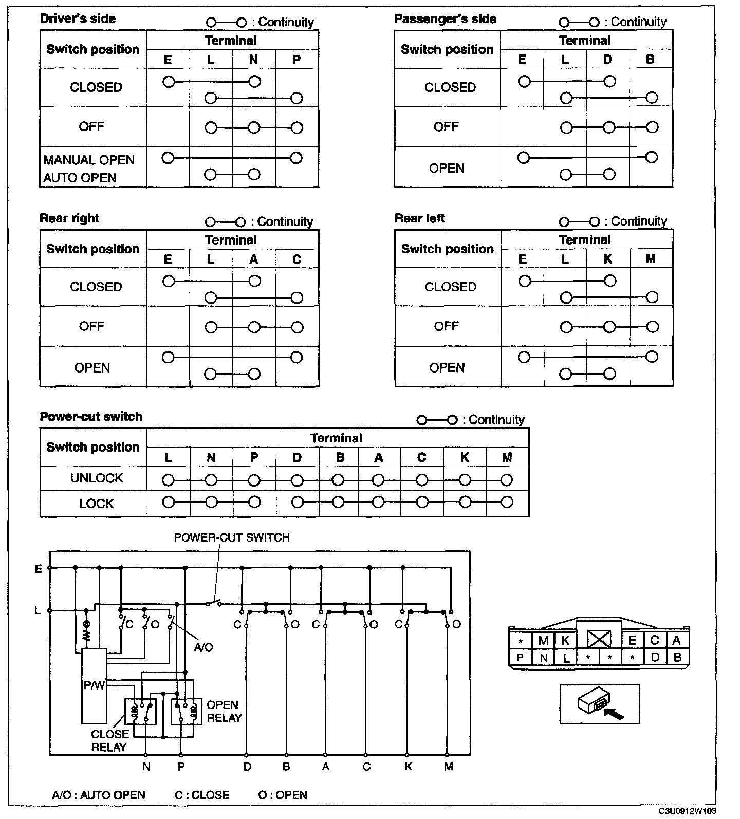 1. When inspecting the passenger-side and rear power windows, turn the power-cut switch to UNLOCK.