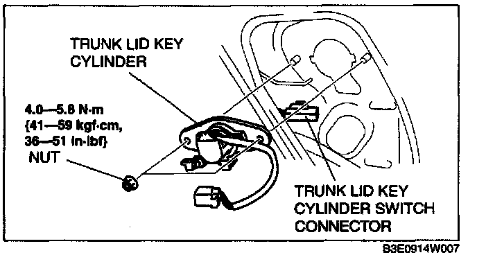 TRUNK LID KEY CYLINDER REMOVAL/INSTALLATION1. Disconnect the negative battery cable.