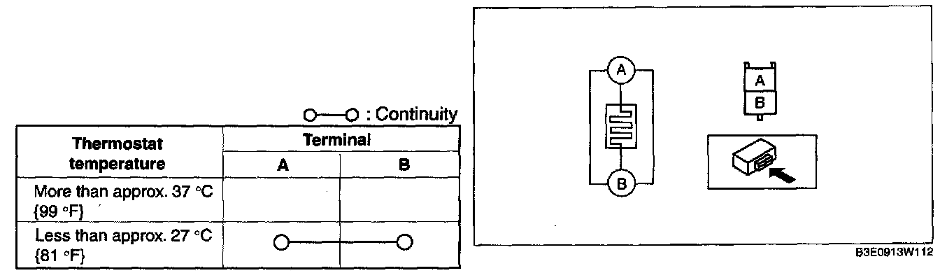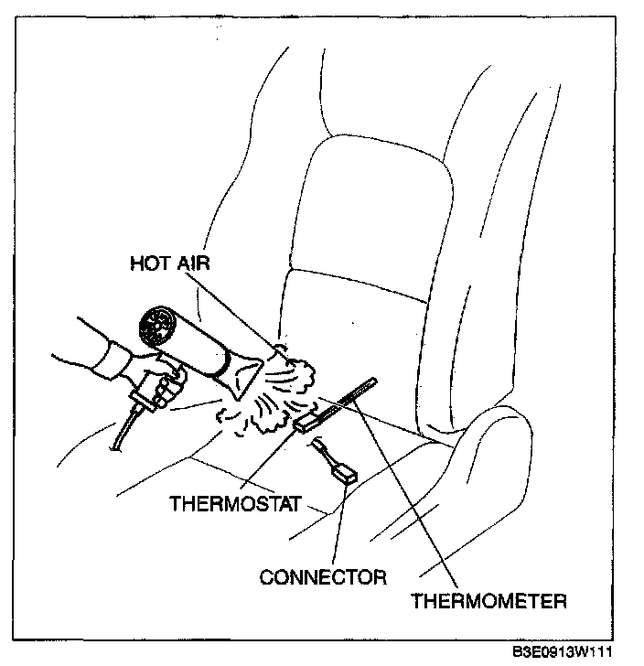 3. While inspecting for continuity between the terminals A and B of the connector, use a dryer to warm the thermostat of the seat warmer unit on seat cushion.