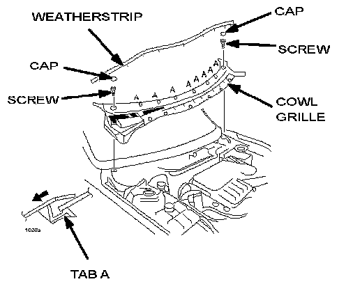 3. Move the cowl grille in the direction indicated by the arrow and disengage tabs A from the windshield.