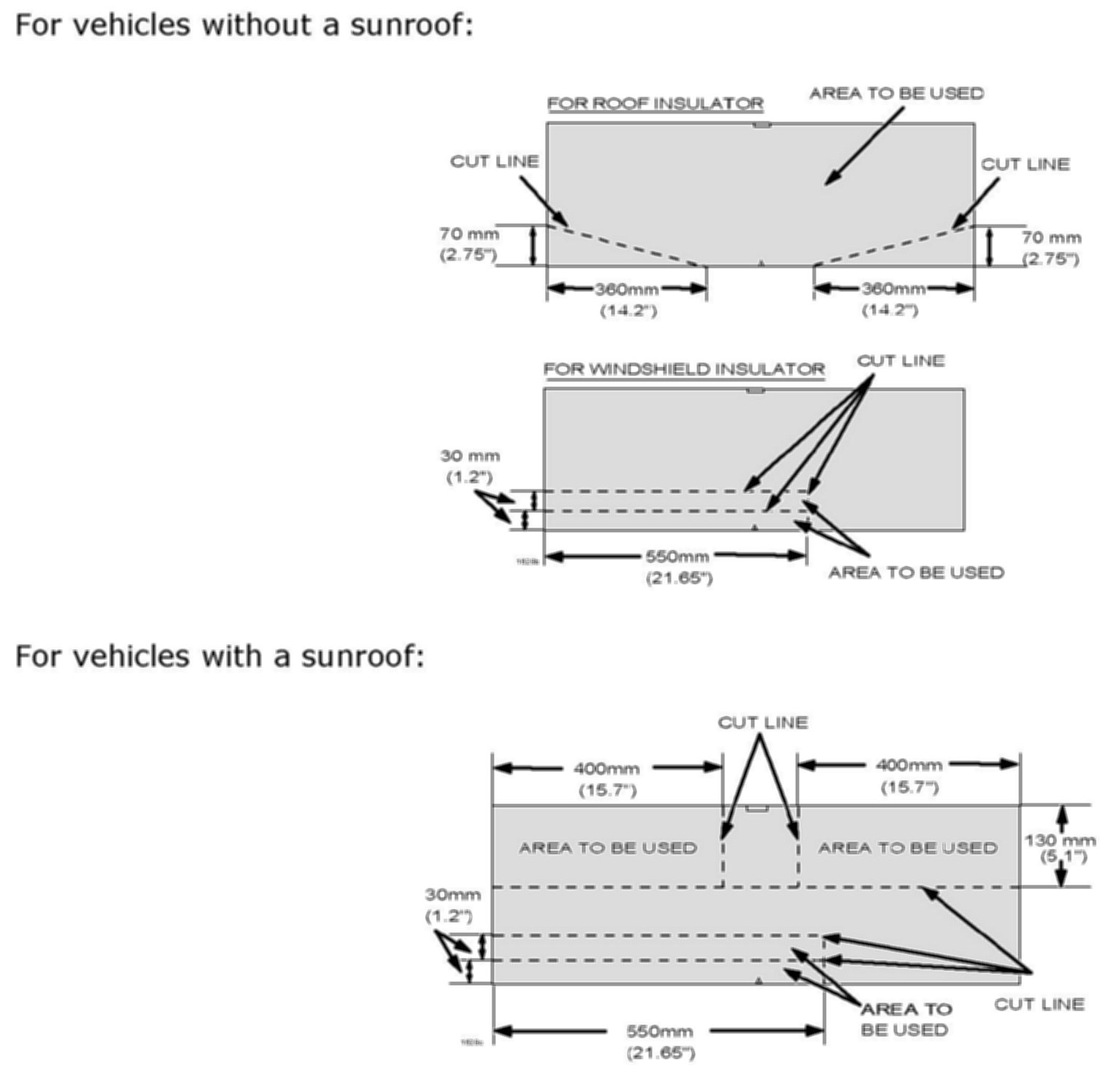 2. Prepare the pieces of roof insulator(s) listed in the PARTS INFORMATION and cut as shown. You will cut two pieces of insulator for vehicles without a sunroof and one piece for vehicles with a sunroof.