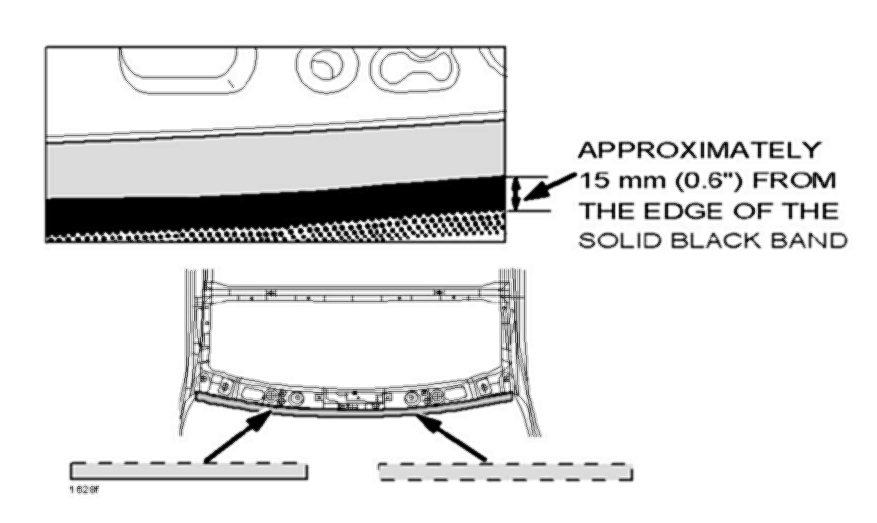 4. Peel the adhesive backing from the windshield insulator and install the windshield insulator as shown. It should be placed 15 mm back from the black band (frit) where it is solid without dots.