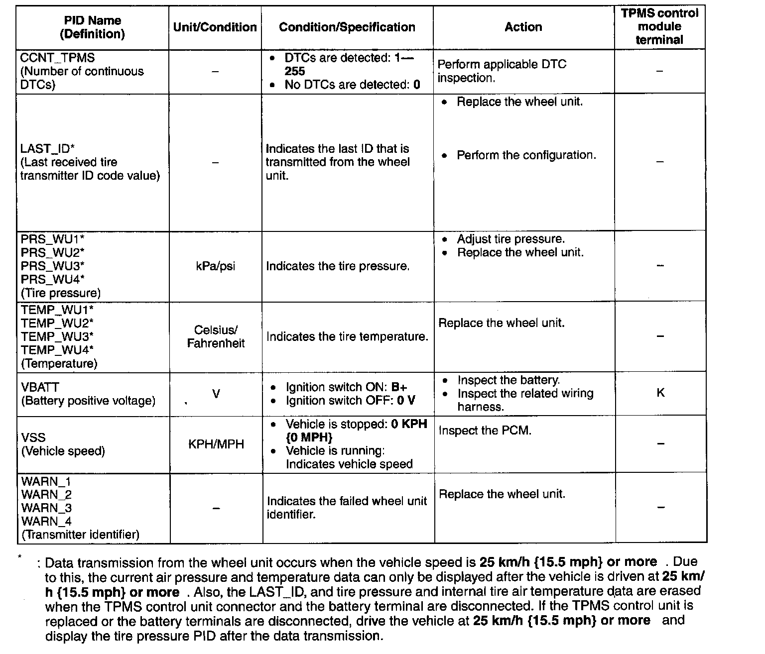 Data transmission from the wheel unit occurs when the vehicle speed is 25 km/h (15.5 mph) or more. Due to this, the current air pressure and temperature data can only be displayed after the vehicle is driven at 25 km/h (15.5 mph) or more. Also, the LAST - ID, and tire pressure and internal tire air temperature data are erased when the TPMS control unit connector and the battery terminal are disconnected. If the TPMS control unit is replaced or the battery terminals are disconnected, drive the vehicle at 25 km/h (15.5 mph) or more and display the tire pressure PID after the data transmission.