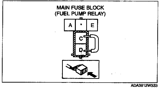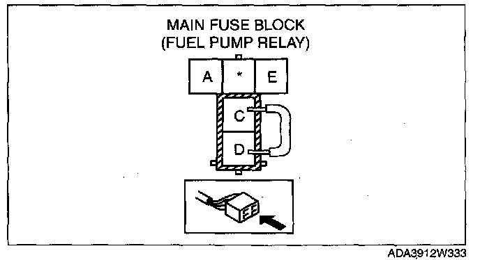 2. Using a jumper wire, short fuel pump relay terminals C and D and connect the negative battery cable to start the fuel pump.