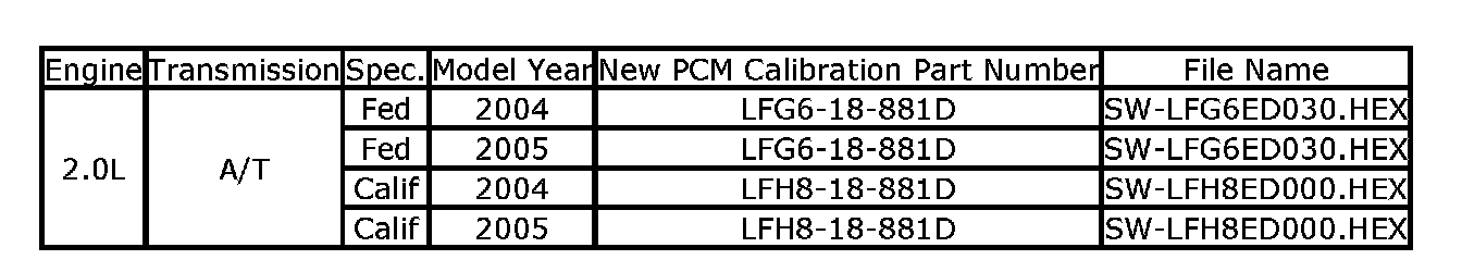The PCM Calibration Part Numbers listed above are provided for PCM reprogramming purposes only. These are not necessarily the same Mazda part numbers used to order an actual PCM through the Mazda Parts System. It is not necessary to order a PCM as part of this repair procedure.
