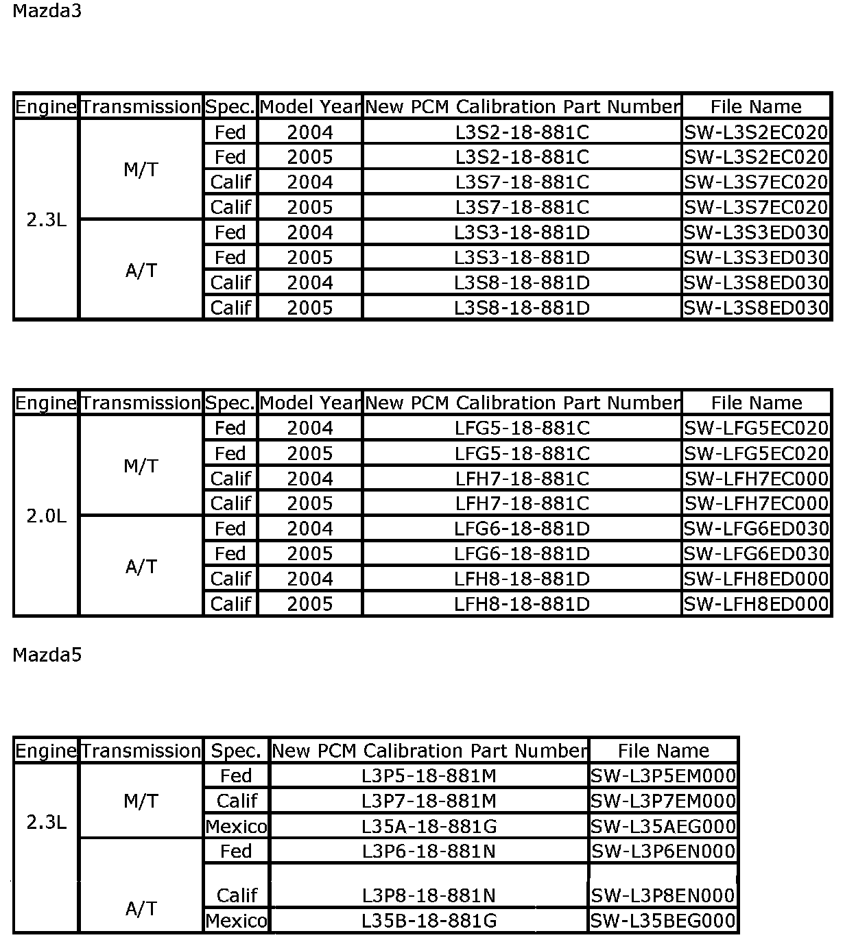 The PCM Calibration Part Numbers listed above are provided for PCM reprogramming purposes only. These are not necessarily the same Mazda part numbers used to order an actual PCM through the Mazda Parts System. It is not necessary to order a PCM as part of this repair procedure.