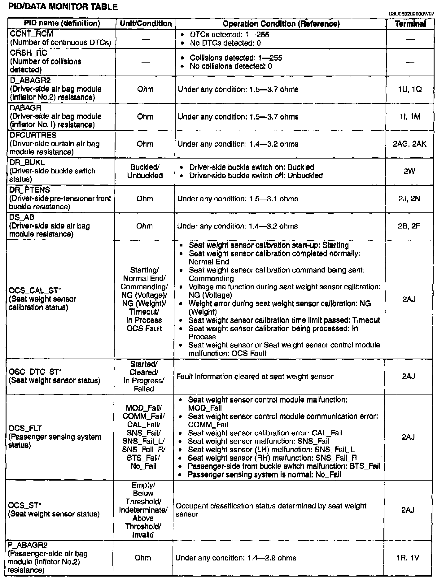 PID/DATA Monitor Table 2: