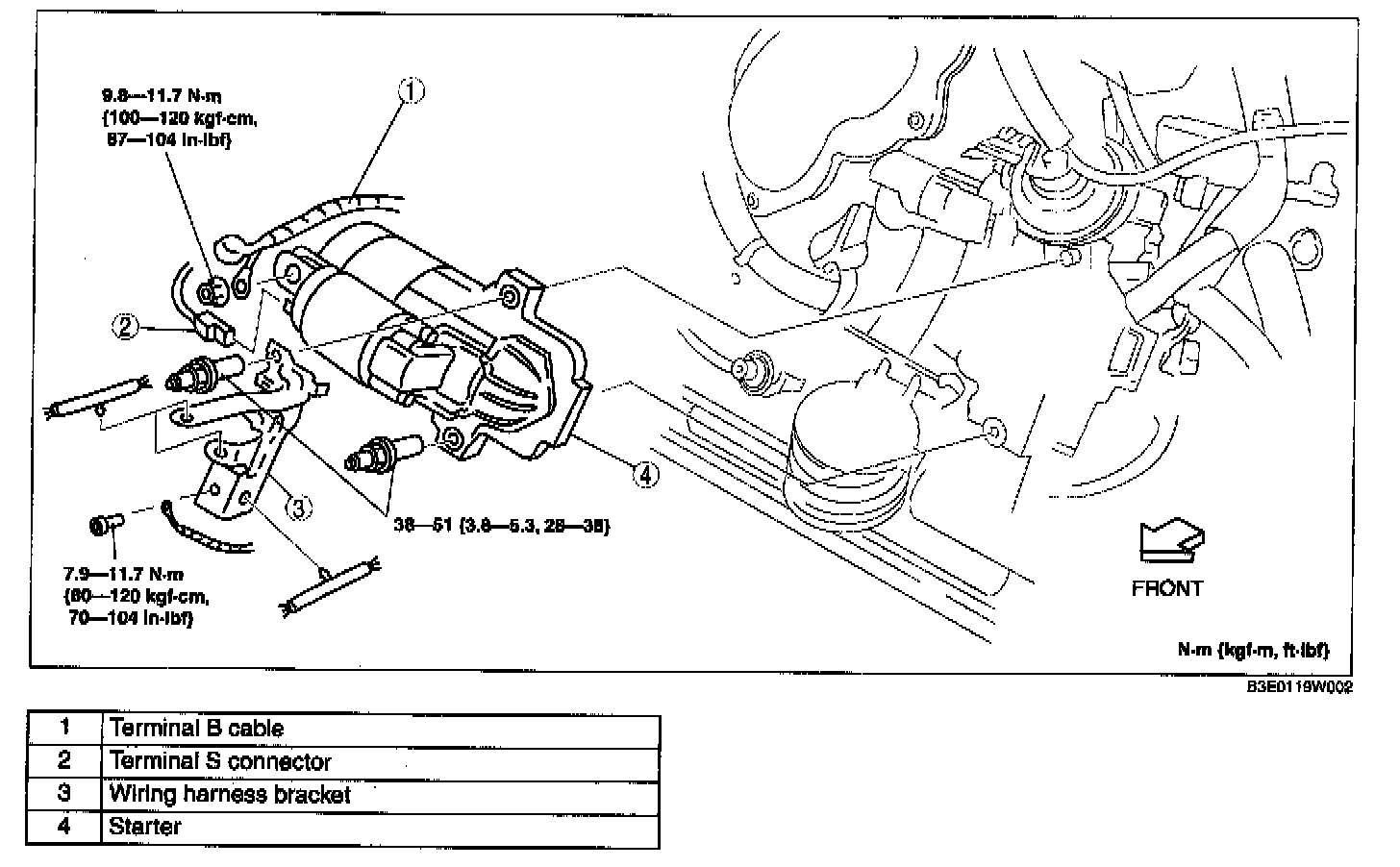 STARTER REMOVAL/INSTALLATIONWARNING: When the battery cables are connected, touching the vehicle body with 8tarter terminal B will generate sparks. This can cause personal injury, fire, and damage to the electrical components. Always disconnect the negative battery cable before performing the following operation.