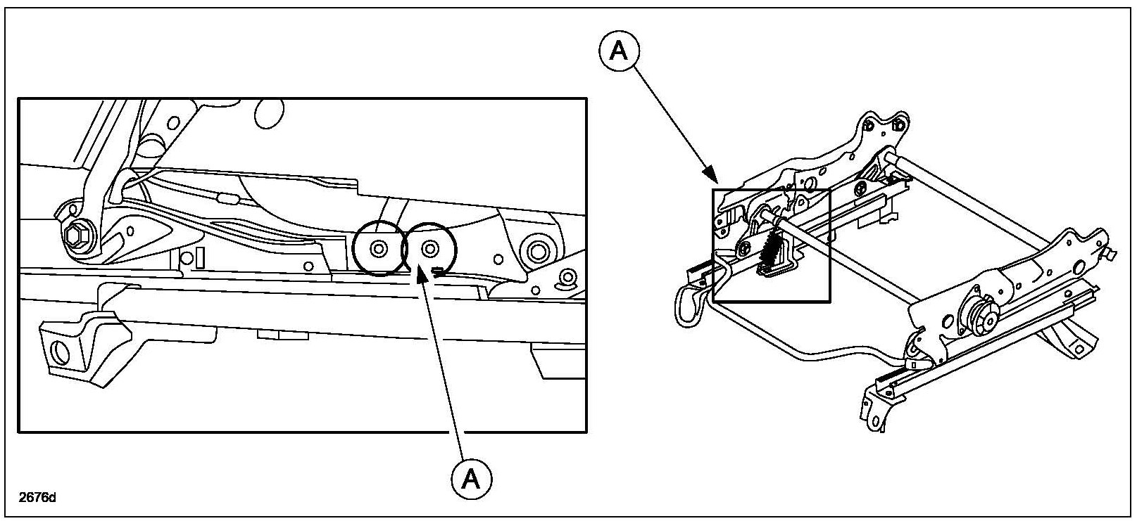 Some customers may complain about a rattle noise in the drivers seat (A) when stopping or starting the vehicle. This rattle noise is caused by a gap between the seat frame and the link bracket. To correct the problem, a bracket and seat spring are attached to the inner and outer seat frames.