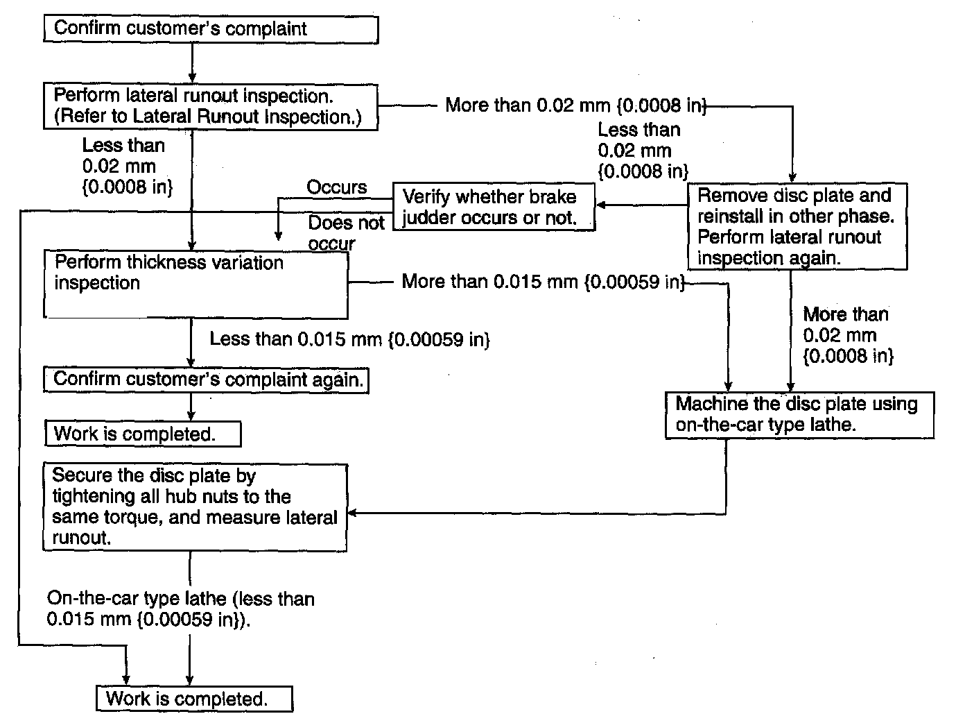 2. If the runout is less than 0.02 mm (0.0008 inch), uneven wear does not occur. The disc plate is deformed by heat.