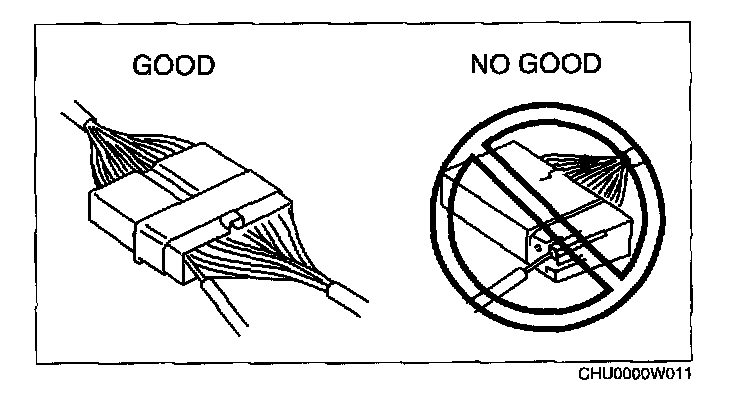 - When a tester is used to inspect for continuity or measuring voltage, insert the tester probe from the wiring harness side.