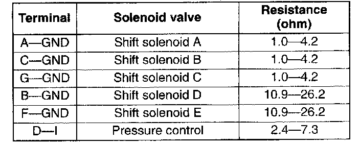 Note: When inspecting the pressure control solenoid, connect the ground connection to the ground terminal (terminal 1) of the pressure control solenoid inside the solenoid valve connector.