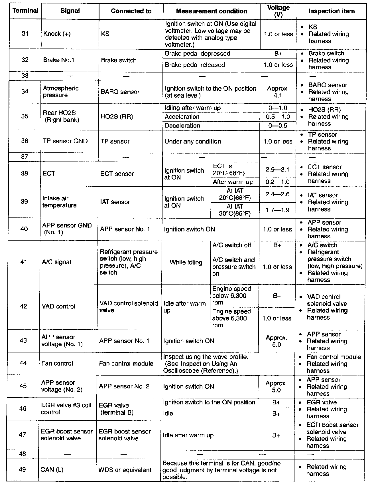 Terminal Voltage Table (Reference) - Terminals (31 - 49):