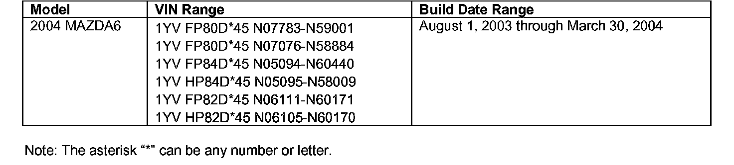 2. You own or have owned a subject 2004 MAZDA6 within the VIN ranges: