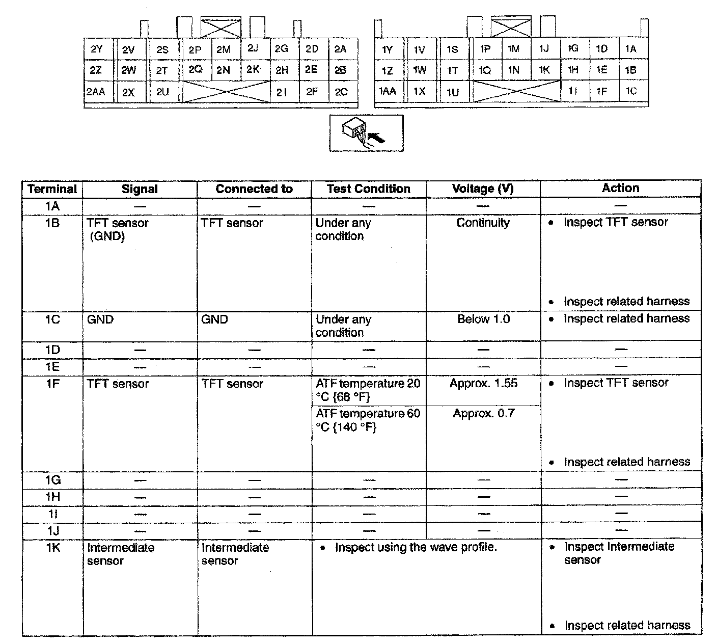 Note: Use the ground of terminals 1C and 1Y of the TCM when measuring terminal voltage, as an error may occur when connecting the negative circuit tester to ground.