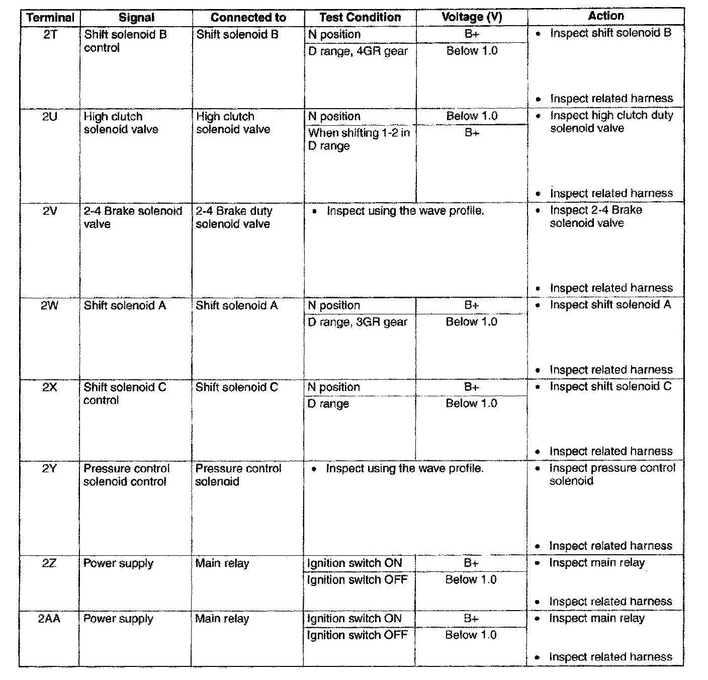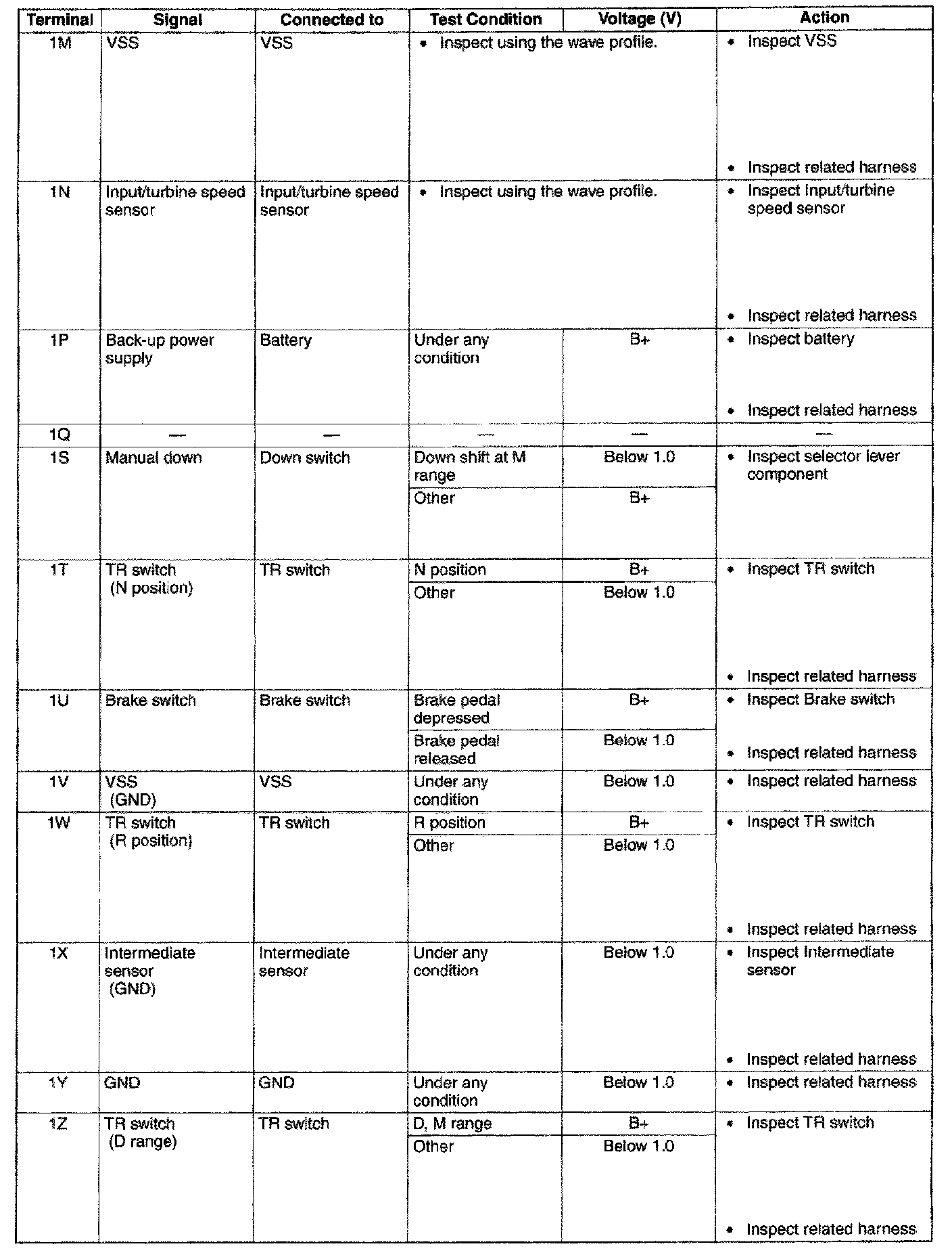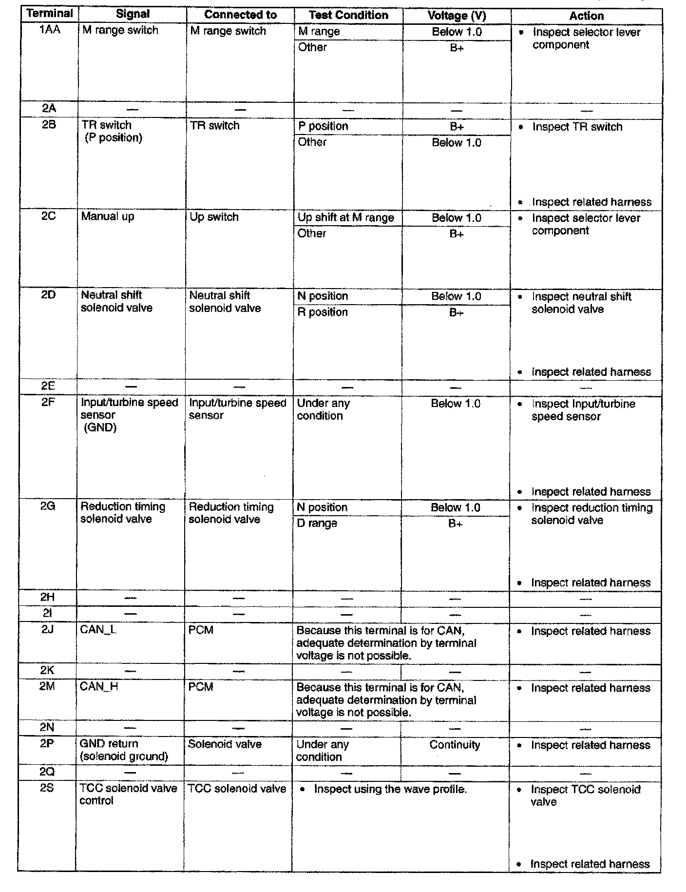 TCM INSPECTION [JA5A-EL]Caution: The TCM terminal voltages vary with changes in measuring and vehicle conditions. Always carry out a total inspection of the input and output systems, and the TCM to determine the cause of trouble. Otherwise, a mix-diagnosis could occur.