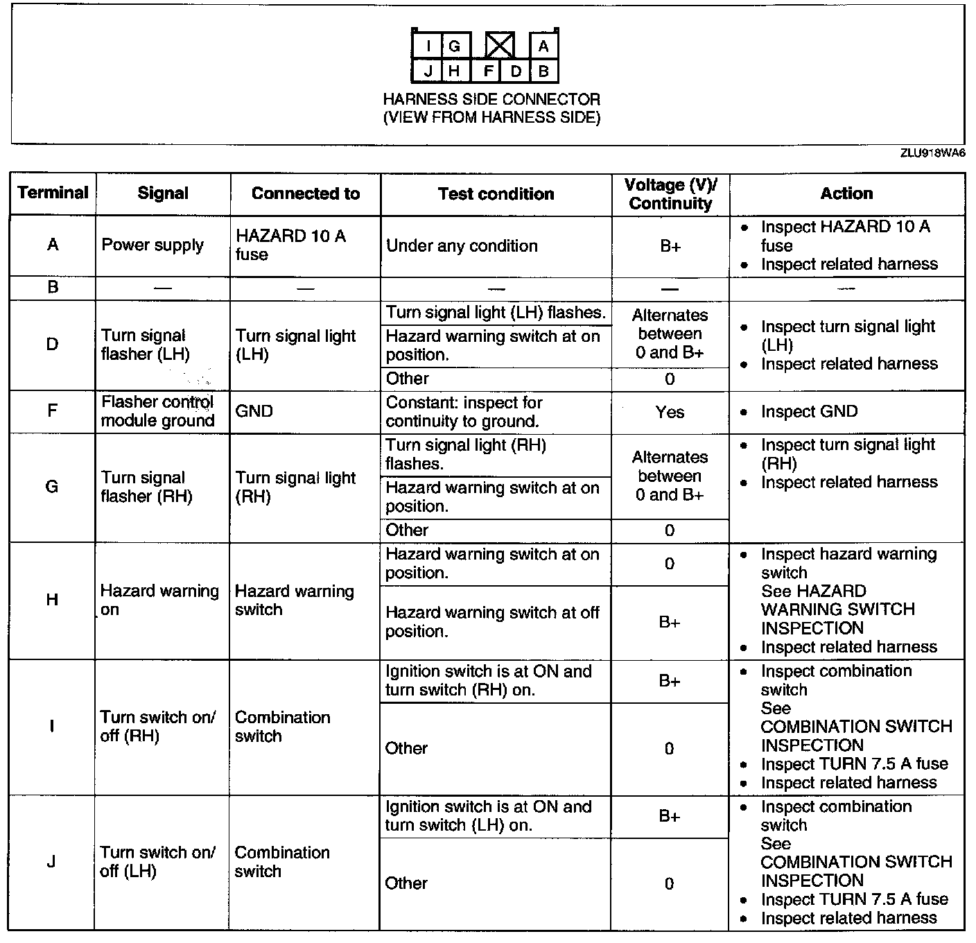 FLASHER CONTROL MODULE INSPECTION1. Measure the voltage at the flasher control module terminals as indicated below