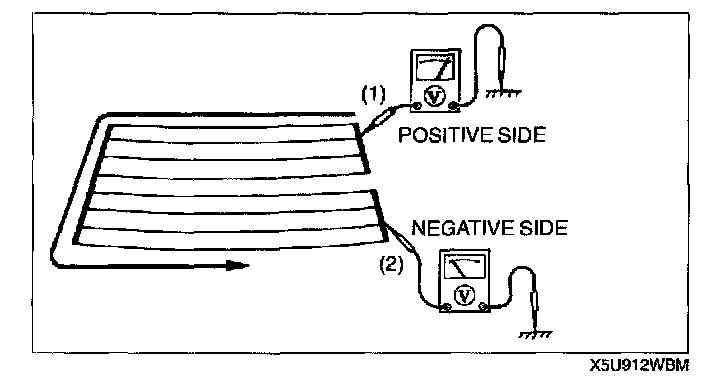 CAUTION: Directly touching the rear window defroster filament with the lead of the circuit tester will damage it. Wrap aluminum foil around the end of the lead and test the filament by touching it with the foil.