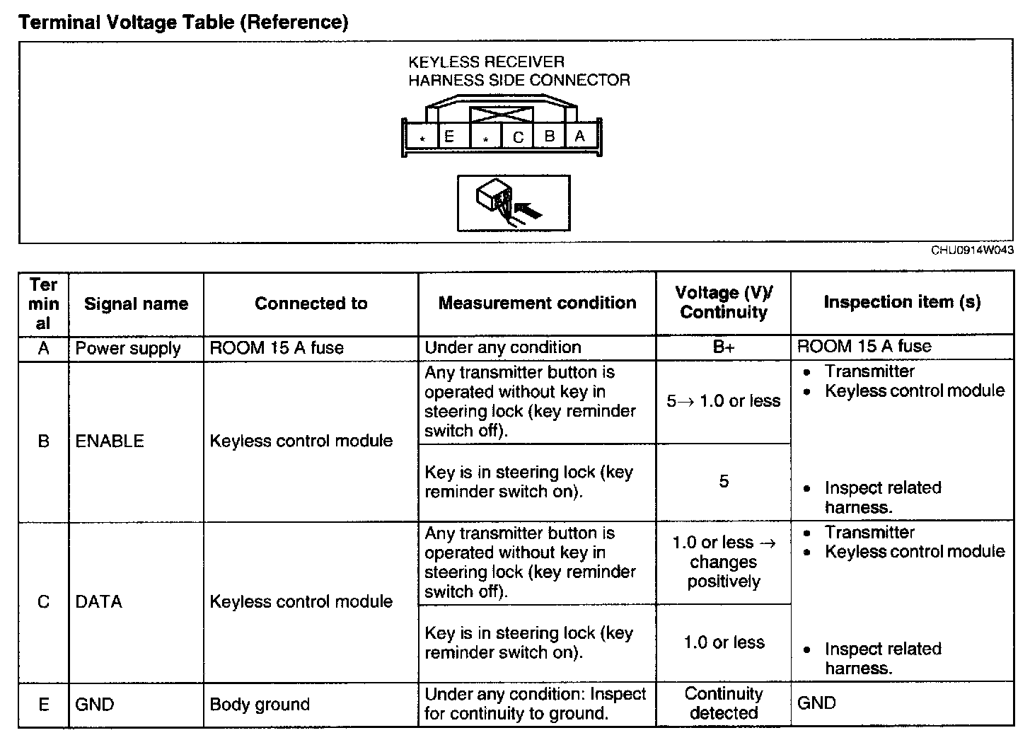 KEYLESS RECEIVER INSPECTION1. Measure the voltage at each terminal.