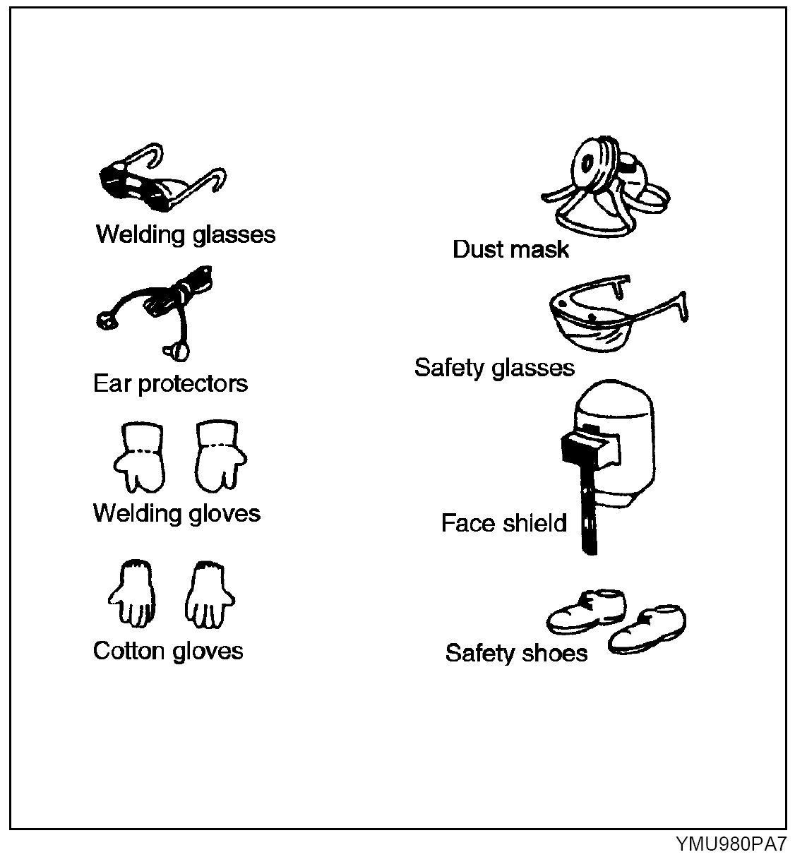 - Protective head covering and safety shoes should always be worn. Depending upon the nature of the work, gloves, safety glasses, ear protectors, face shield, etc., should also be used.