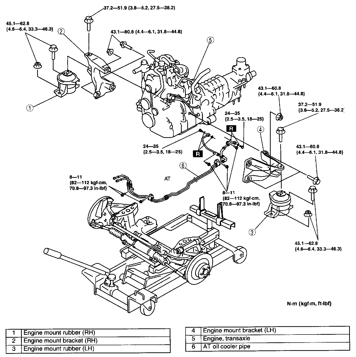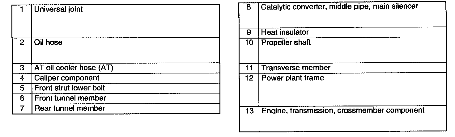 14. Remove the engine, transmission, and crossmember component using an engine lifter in the order indicated in the table.