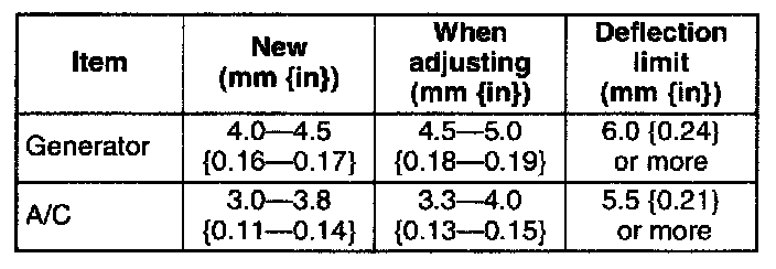 ^ After replacing with a new drive belt, assemble with the deflection/tension for the new drive belt. Operate the generator drive belt for 1 min or more and the A/C drive belt for 5 min or more while idling the engine. Then adjust it to the deflection/tension used when adjusting.