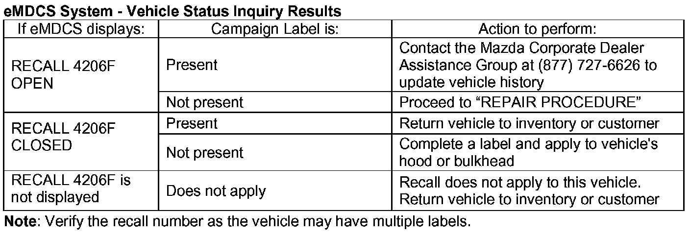 2. Perform a Warranty Vehicle Inquiry using your eMDCS System and inspect vehicle for Campaign Label RECALL 4206F attached to the vehicle's hood or bulkhead.