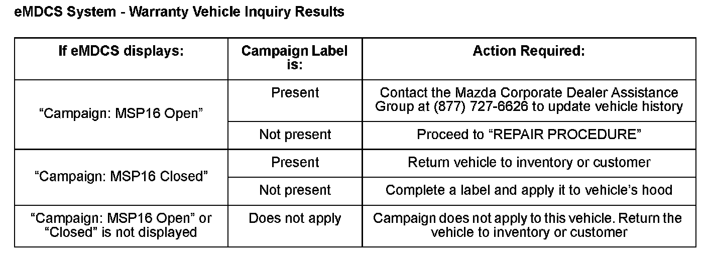 ^ BEFORE PERFORMING ANY REPAIR, VALIDATE THAT THE VEHICLE IS APPLICABLE TO THIS PROGRAM BY PERFORMING AN "eMDCS WARRANTY VEHICLE INQUIRY" AND VERIFYING THE VEHICLE DISPLAYS CAMPAIGN "MSP16" AND ITS CAMPAIGN STATUS DISPLAYS "OPEN". SEE "VEHICLE INSPECTION PROCEDURE" BELOW.