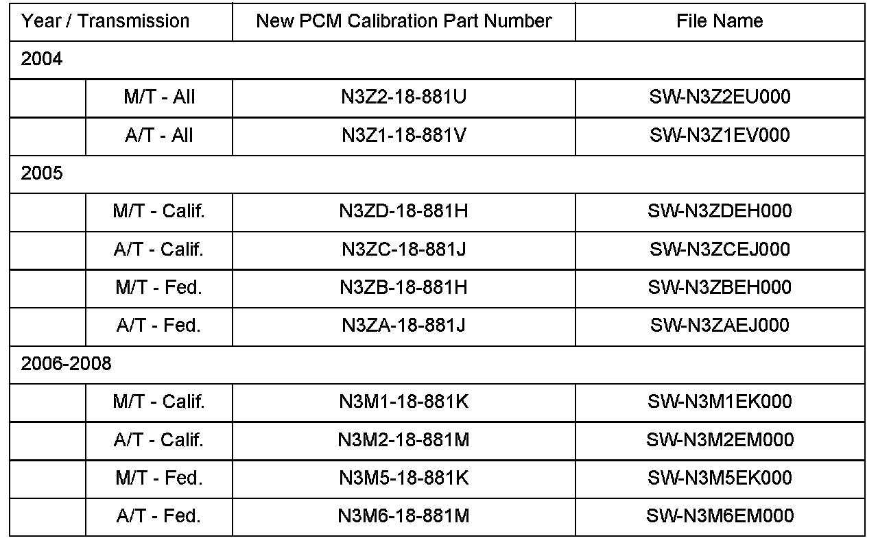 The PCM Calibration Part Numbers listed above are provided for PCM reprogramming purposes only. These are not necessarily the same Mazda part numbers used to order an actual PCM through the Mazda Parts System. It is not necessary to order a PCM as part of this repair procedure.