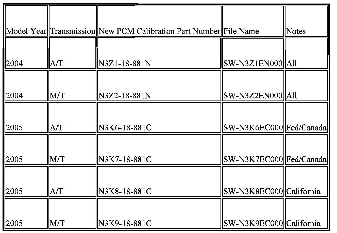 The PCM Calibration Part Numbers listed above are provided for PCM reprogramming purposes only. These are not necessarily the same Mazda part numbers used to order an actual PCM through the Mazda Parts System. It is not necessary to order a PCM as part of this repair procedure.