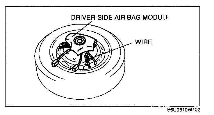3. Place the driver-side air bag module on the center of the tire wheel with the padded surface facing up. To secure the air bag module to the tire wheel, wrap a wire (cross section 1.25 sq.m {0.002 in sq} or more) through the wheel and the bolt installation holes of the air bag module at least 4 times.