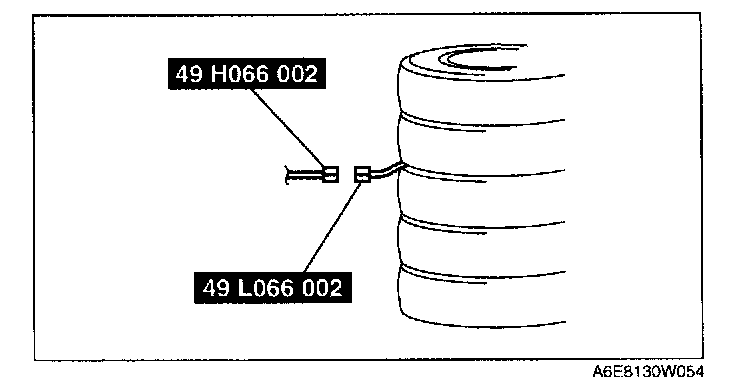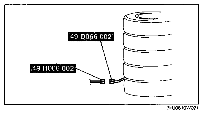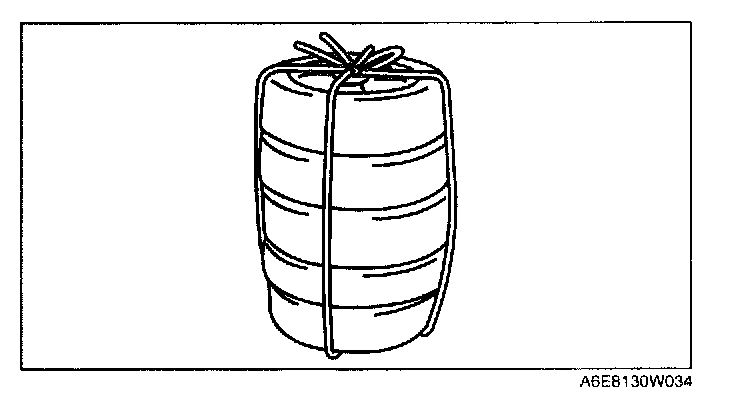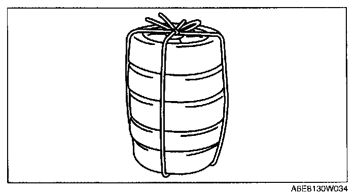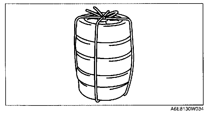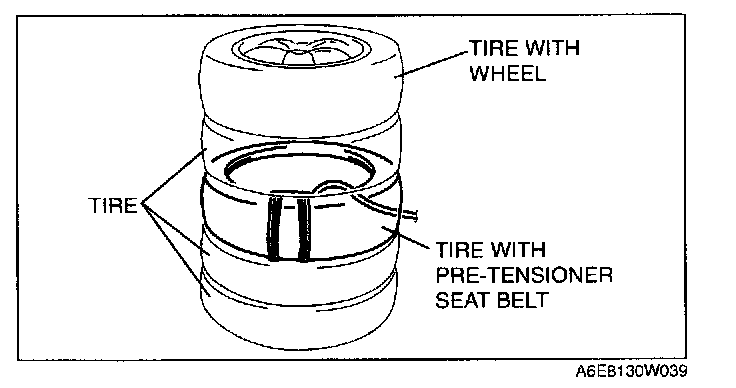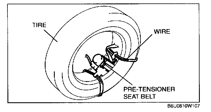 3. Put the pre-tensioner seat belt inside the tire and secure it to the tire by wrapping a wire (cross section 1.25 sq.m {0.002 in2} or more) through the tire and the bolt installation holes at least 4 times.
