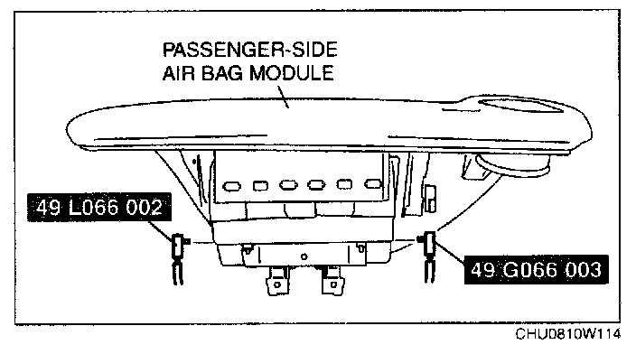 WARNING: The passenger-side air bag module is a dual inflator type. If one inflator is forced to operate (deploy), the other may operate (deploy) accidentally. To prevent injury while disposing of the air bag module, make sure to operate (deploy) both passenger-side air bag module inflators simultaneously, following the procedure below.