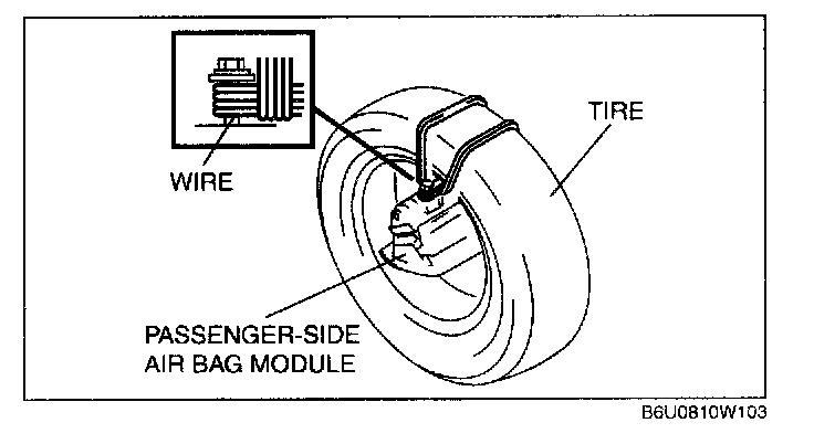 4. Place the padded surface of the passenger-side air bag module facing the center of the tire as shown in the figure. To secure the air bag module to the tire wheel, wrap a wire (cross section 1.25 sq.m {0.002 in2} or more) through the tire and around the bolts at least 4 times.