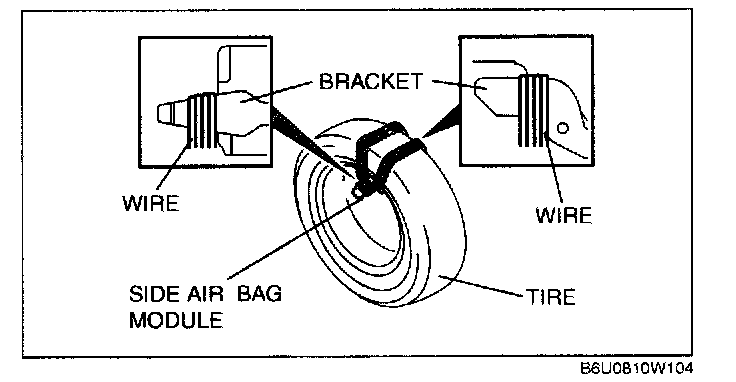3. Place the padded surface of the side air bag module facing the center of the tire as shown in the figure. To secure the air bag module to the tire wheel, wrap a wire (cross section 1.25 sq.m {0.002 in2} or more) through the tire and around the brackets at least 4 times.