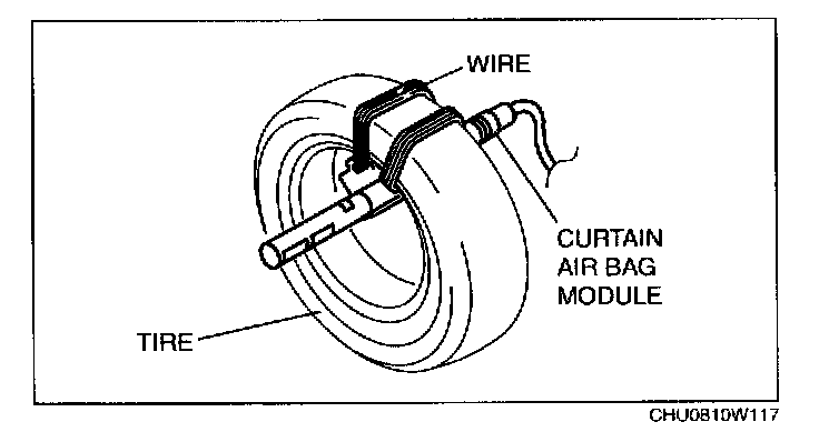 3. Secure the curtain air bag module to the tire, by wrapping a wire (cross section 1.25 sq.m {0.002 in2} or more) through the tire and the bolt installation holes at least 4 times as shown in the figure.