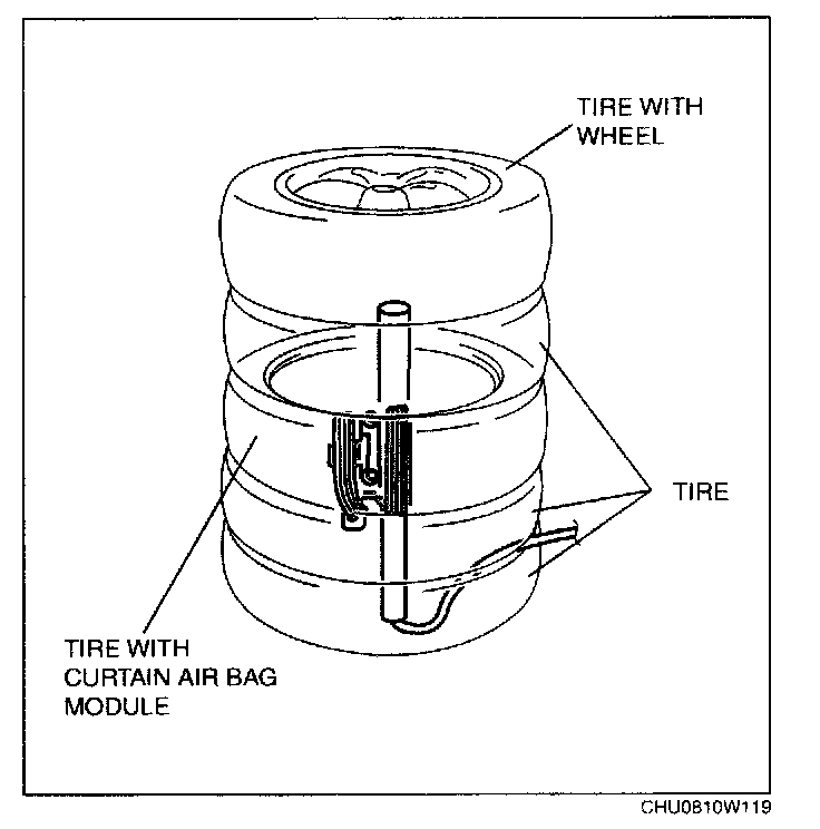 5. Stack the tire with the curtain air bag module on top of two tires without wheels. Stack a tire without a wheel on top of the tire with the curtain air bag module, and then stack another tire with a wheel on the very top.
