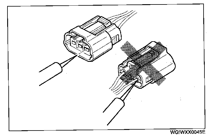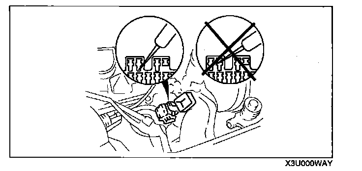 - When a tester is used to inspect for continuity or measuring voltage, insert the tester probe from the wiring harness side.