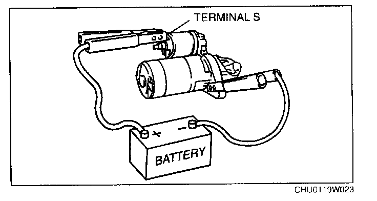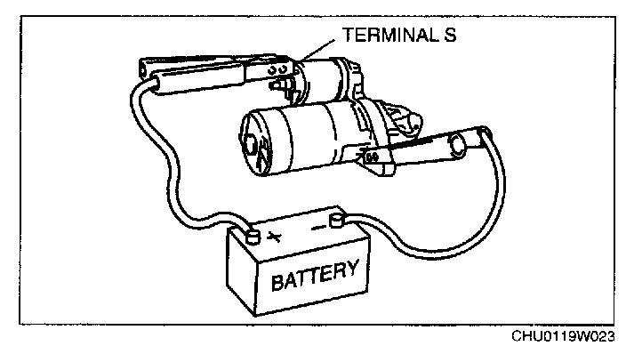 1. Verify that the drive pinion is pulled out with battery positive voltage connected to terminal S and the starter body grounded.