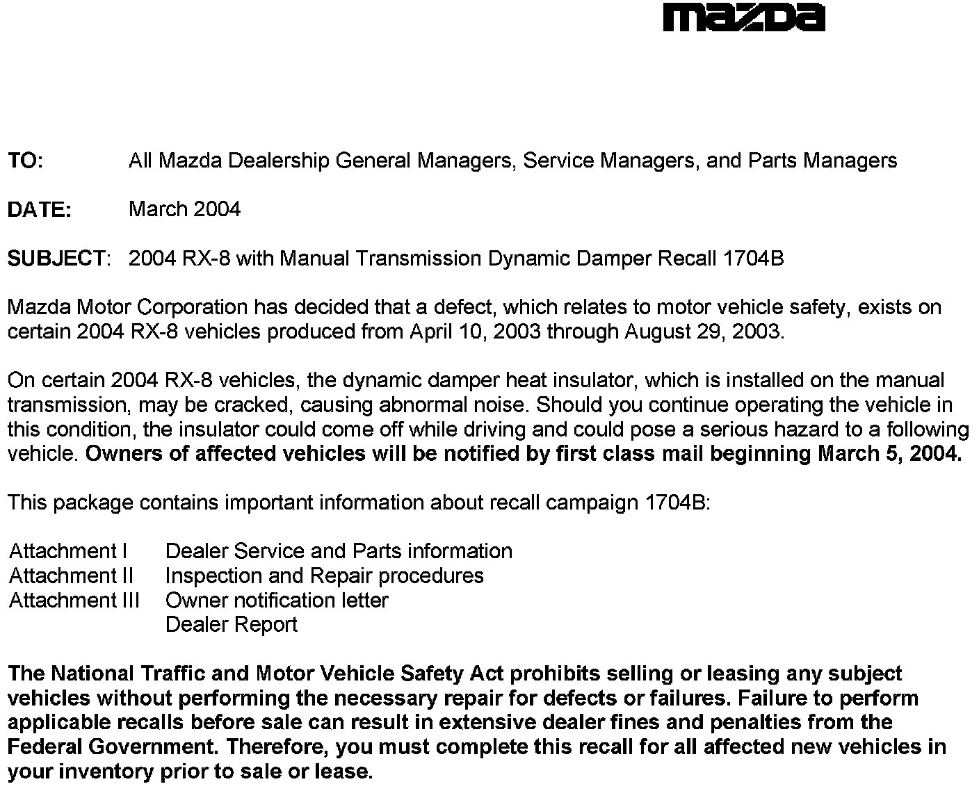 Recall - M/T Dynamic Damper Heat Shield Replacement