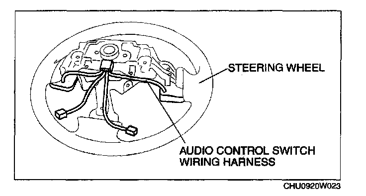 1. Install the audio control switch so that the audio control switch wiring harness passes behind the steering wheel as shown in the figure.