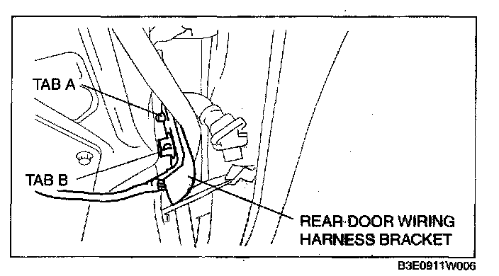 4. Remove tabs A and B, then remove the rear door wiring harness bracket.