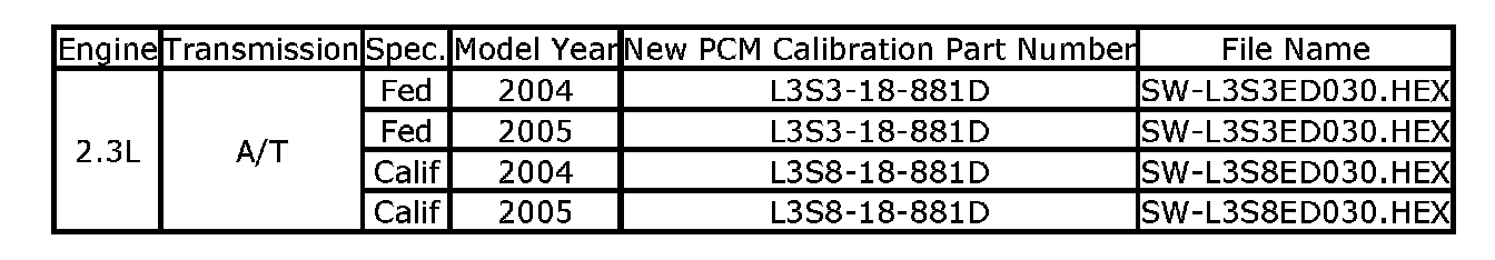 The PCM Calibration Part Numbers listed above are provided for PCM reprogramming purposes only. These are not necessarily the same Mazda part numbers used to order an actual PCM through the Mazda Parts System. It is not necessary to order a PCM as part of this repair procedure.