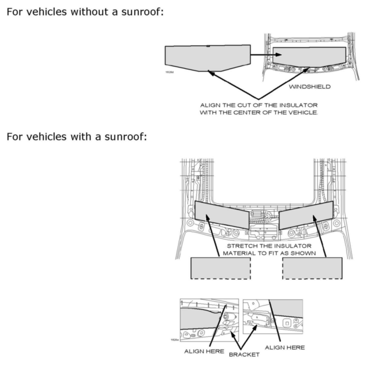 2. Prepare the pieces of roof insulator(s) listed in the PARTS INFORMATION and cut as shown. You will cut two pieces of insulator for vehicles without a sunroof and one piece for vehicles with a sunroof.