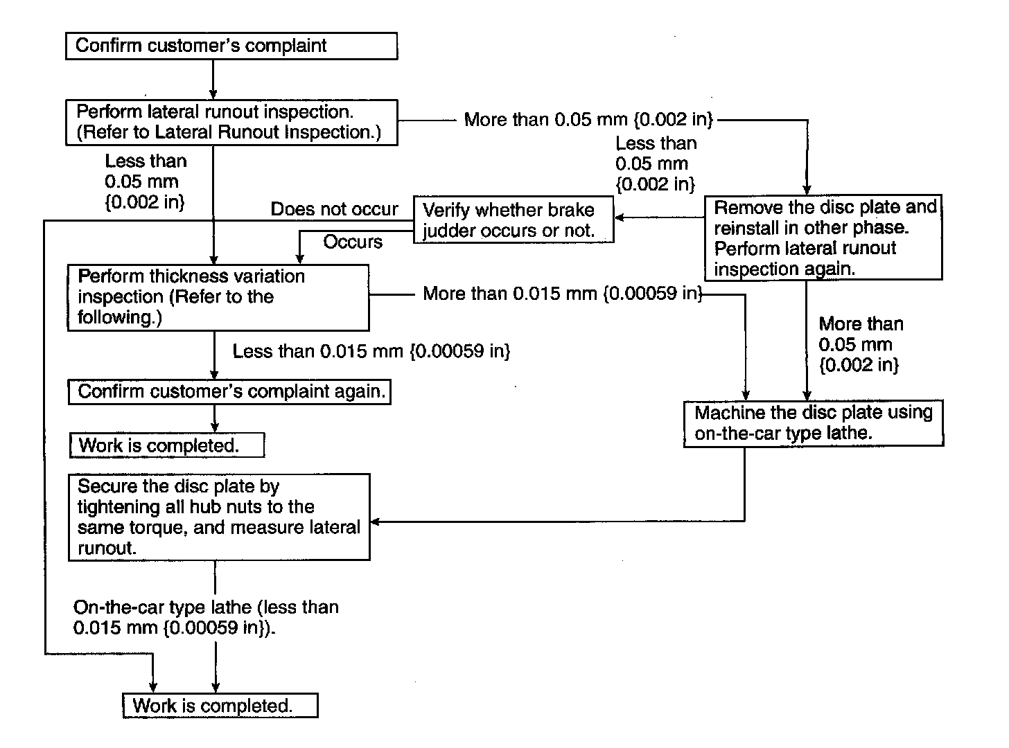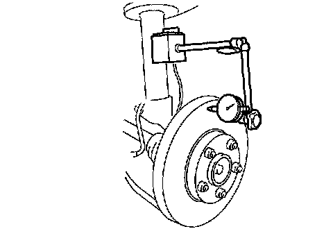 1. If the runout is more than 0.05 mm (0.002 inch) at the position 10 mm (0.39 inch) from the disc plate edge, uneven wear occurs on the disc plate because the pad contacts the plate unevenly