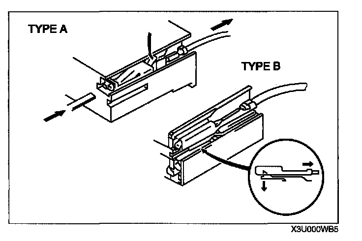 - Use the appropriate tools to remove a terminal as shown. When installing a terminal, be sure to insert it until it locks securely.