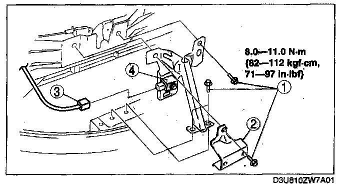 1. Align the alignment marks on the hood latch and shroud panel made prior to removal and install the crash zone sensor.