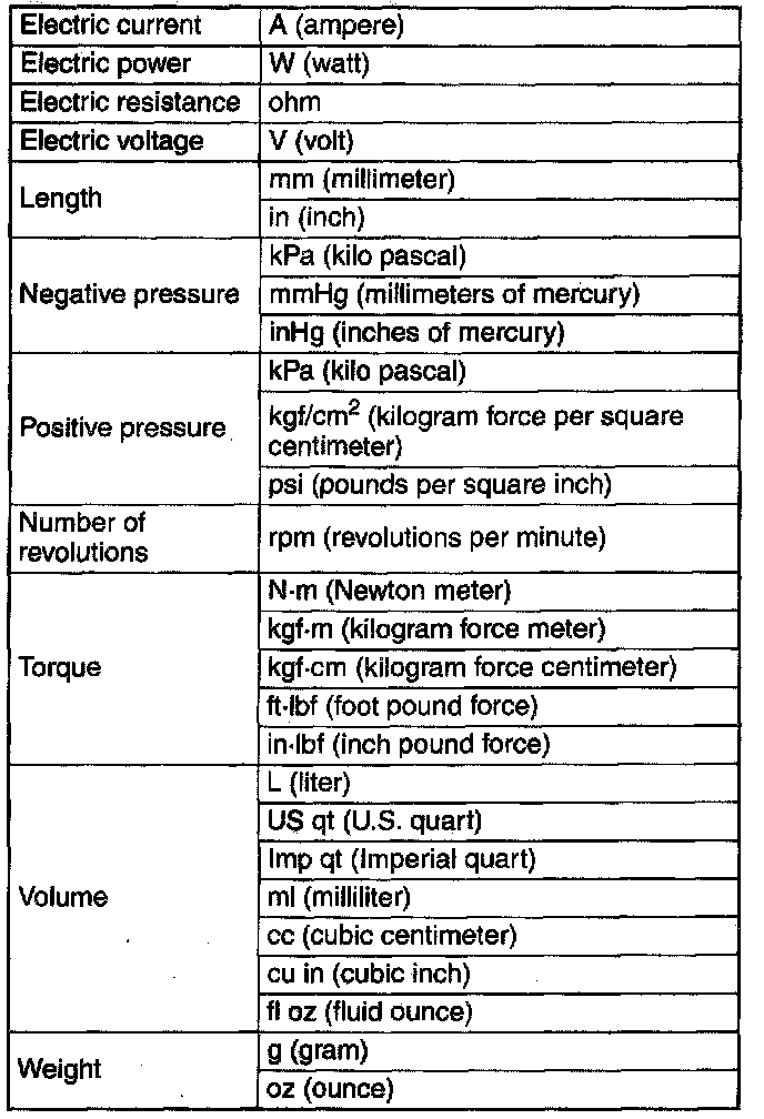 - All numerical values in this manual are based on SI units. Numbers shown in conventional units are converted from these values.